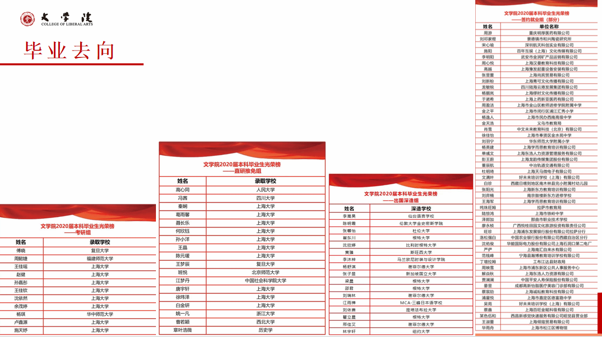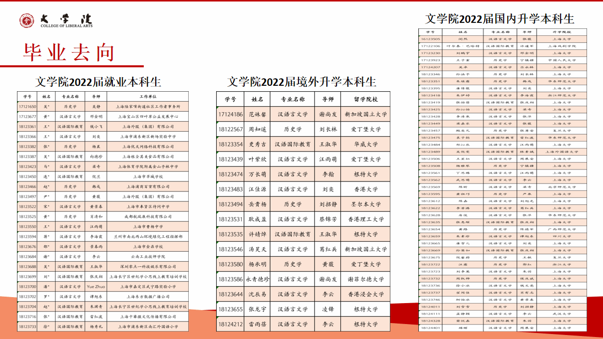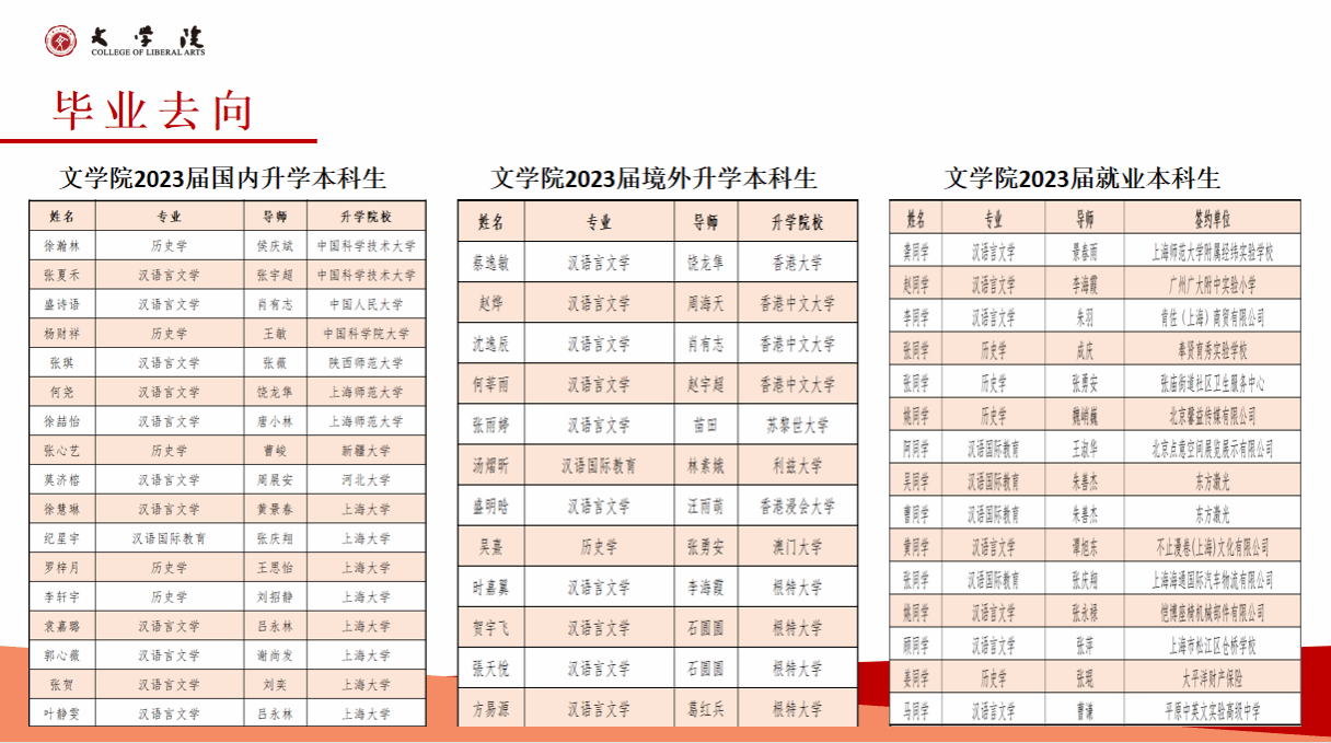 tcy8722太阳集团2023年的本科毕业生的就业率为89.66%,就业方向主要集中在教育、机关事业、文化艺术、出版编辑等行业和领域,就业行业的分布相对较广,其中部分优秀毕业生入职华为、腾讯、振华重工等全球五百强企业。近年来,超过30%的本科生毕业后选择继续深造,其中2023年继续深造比例达47.4%。多人考取或免试直升复旦大学、中山大学、中国人民大学、武汉大学等国内名牌大学。出国(境)深造比例也在持续提升,2023年出国(境)学生中,50%进入QS全球排名前100的国际一流高校攻读硕士学位,香港大学、香港中文大学、利兹大学、苏黎世大学、诺丁汉大学等。