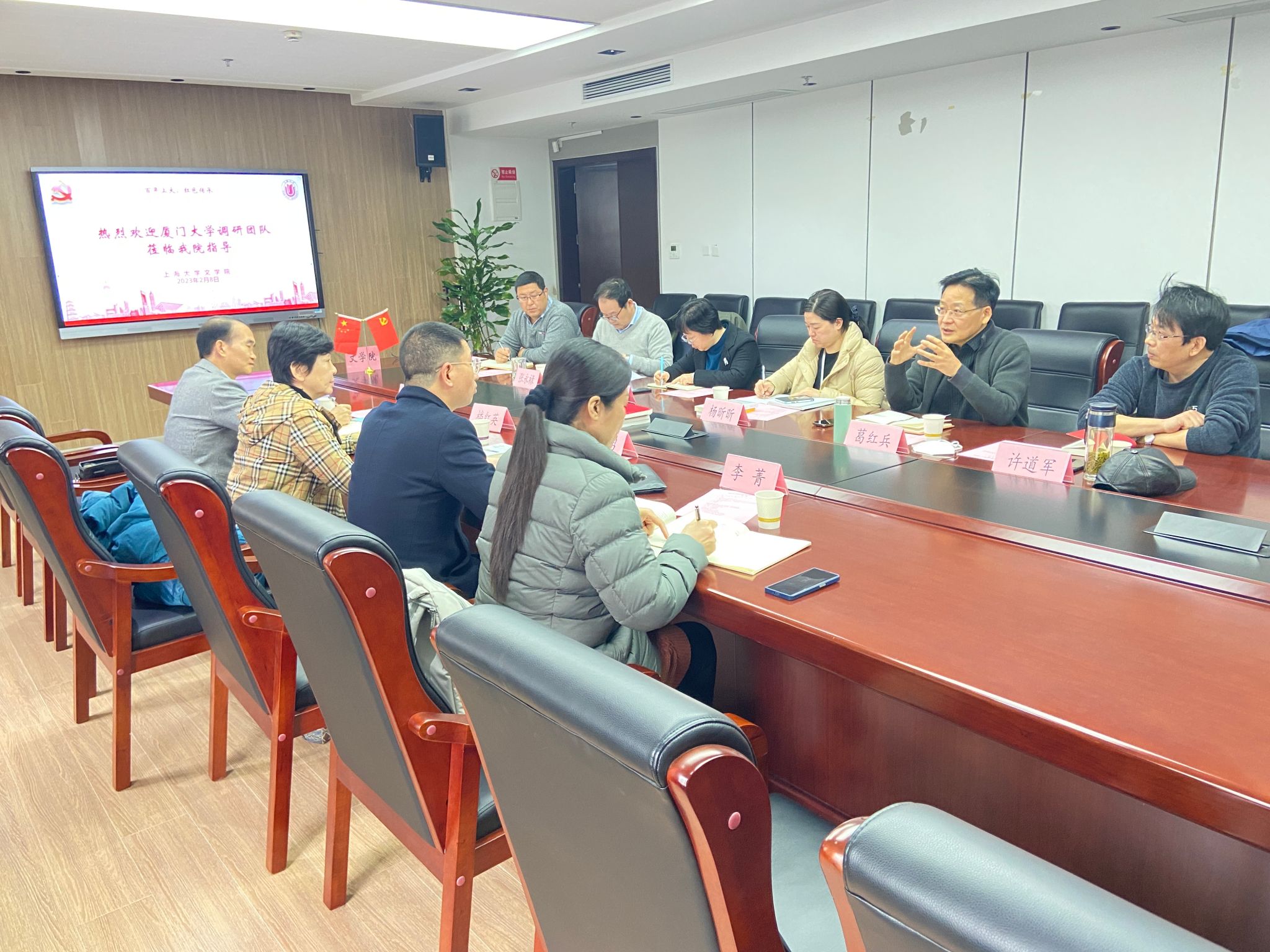 2月8日,为借鉴、参考我校创意写作学科课程建设、学生培养等经验,厦门大学美育与通识教育中心副主任、教务处副处长楼红英,厦门大学中国语言文学系副主任徐勇教授等一行,来访我院创意写作学科,与学科负责人和相关教师进行了深入交流。太阳集团tcy8722教务部教学建设处处长杨昕昕,tcy8722太阳集团副院长倪兰,厦门大学中文系李菁副教授、苏永延副教授,太阳集团tcy8722创意写作学科许道军教授、谢尚发博士等参加了座谈会。