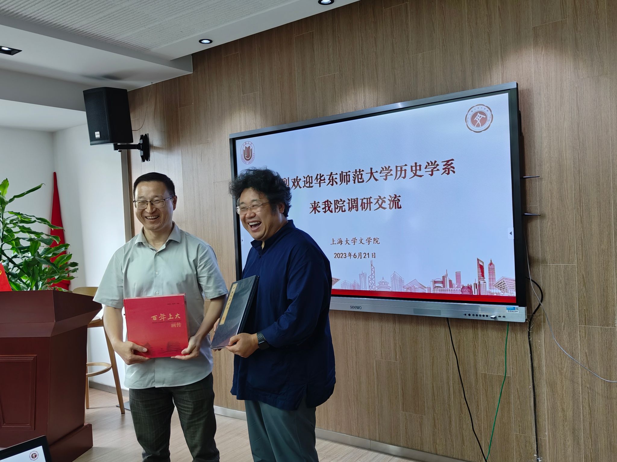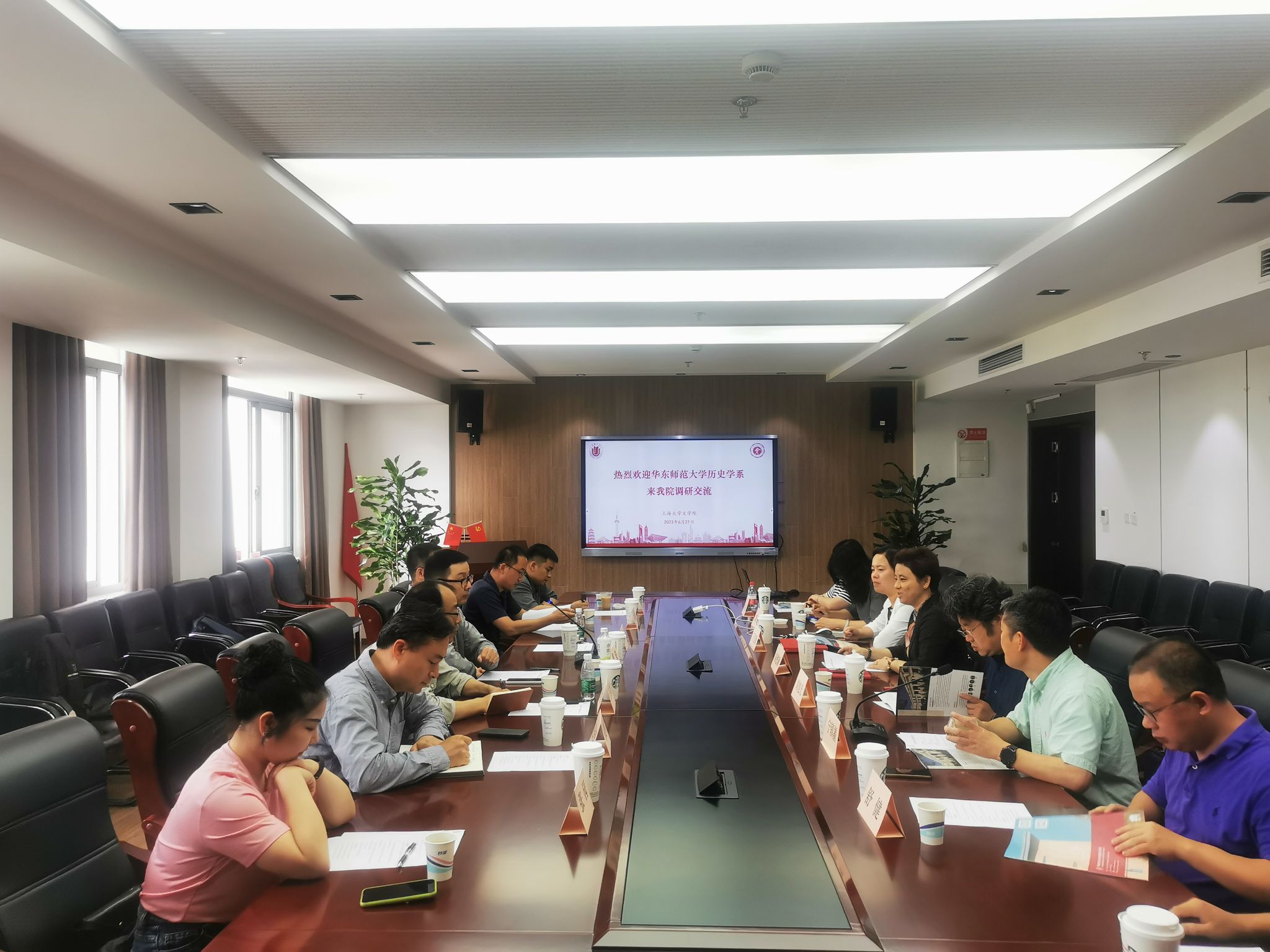 6月21日下午,华东师范大学历史学系由党委书记瞿骏带队来我院调研。院党委书记陆甦颖,党委副书记、院长刘旭光,党委副书记、副院长丁佳蒙,副院长宁镇疆热情接待了瞿骏书记一行。历史学系系主任郭丹彤、副主任舒健、黄凯,党支部书记朱虹等参与座谈交流。会议由副院长宁镇疆主持。