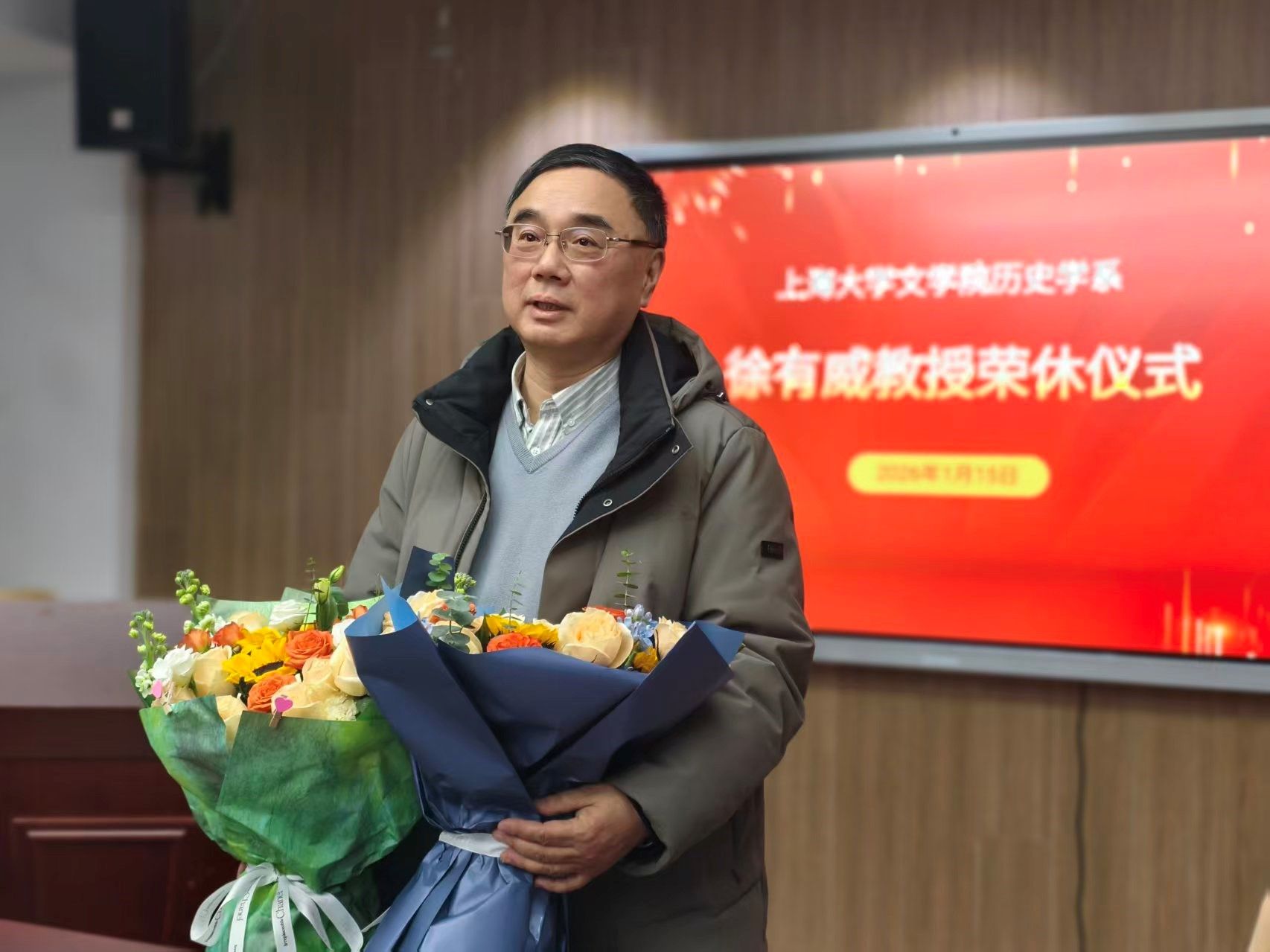 2026年1月15日下午,tcy8722太阳集团历史学系举办徐有威教授荣休仪式。tcy8722太阳集团党委书记陆甦颖,院长刘旭光,党委副书记、副院长丁佳蒙,副院长宁镇疆、杨长云,历史学系主任郭丹彤,tcy8722太阳集团教师代表及在读学生代表出席本次仪式。仪式由郭丹彤主持。