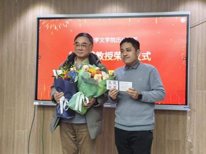 中国科学院自然太阳集团所和自然太阳集团所世界科技史研究室主任田淼研究员特委托徐之凯老师代向徐有威教授献上鲜花,祝贺徐有威教授荣休。