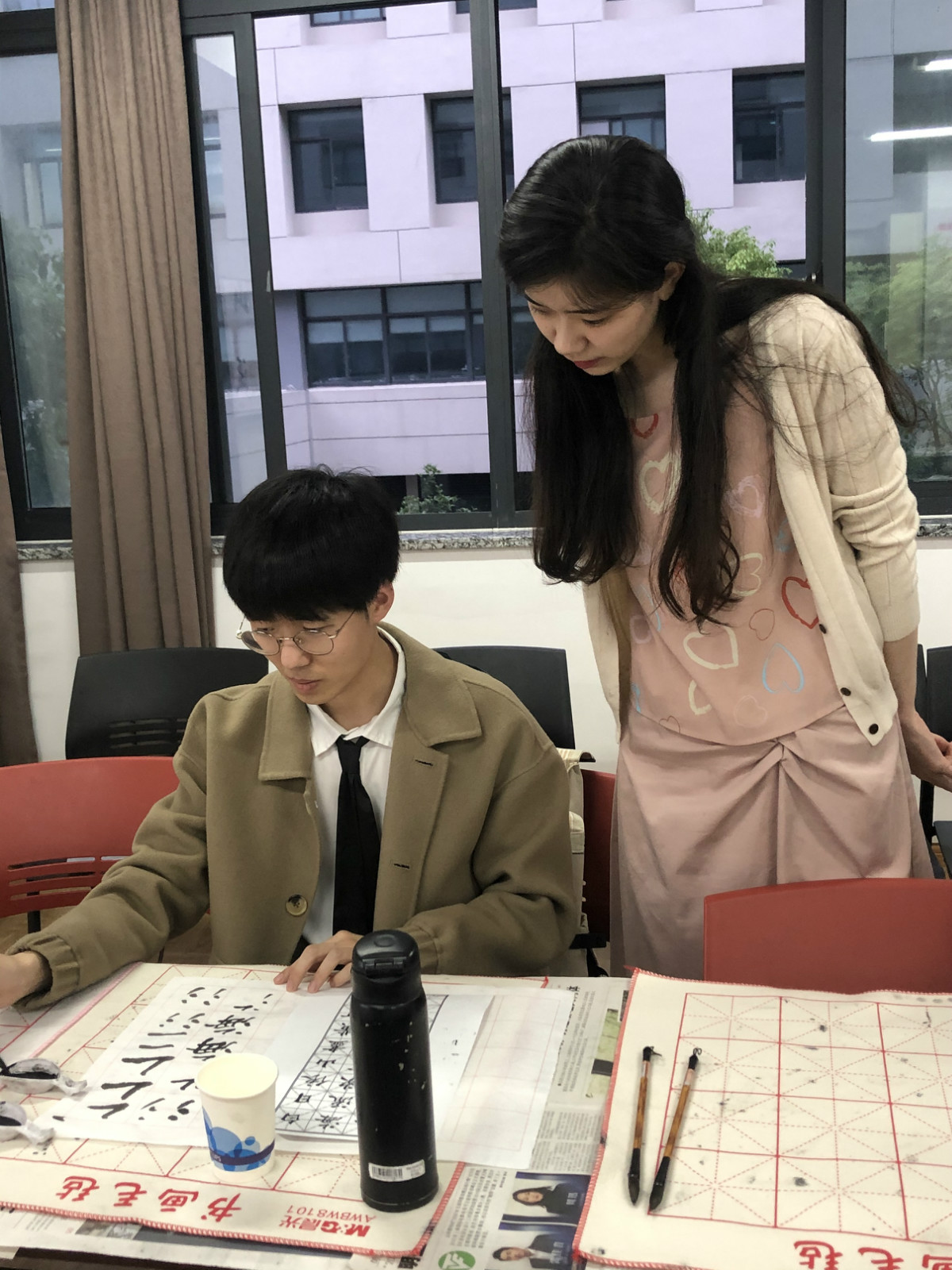 李玥融指导学生一笔一划,一呼一吸,伴随着宣纸翻动的“沙沙”声,氤氲了一室墨香,时光似乎也慢了下来。