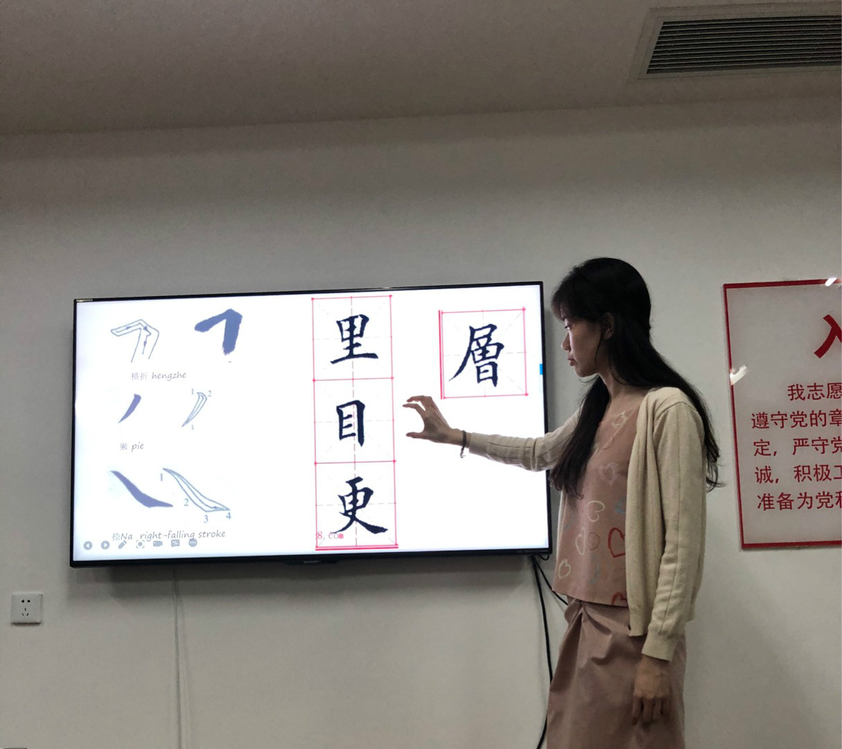 课程伊始,书法老师李玥融带着同学们一起复习了“海”和“流”二字的书写,并纠正了同学们书写时出现的错误姿势。本次的授课重点为“欲”、“穷”、“千”、“更”和“层”五字的书写。