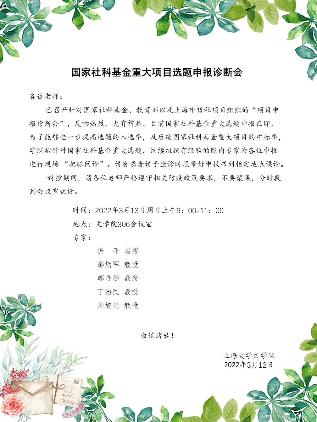 “国家社科基金重大选题申报诊断会”于3月13日上午在学院306会议室举行,为了能够进一步提高选题的入选率,及后续国家社科基金重大项目的中标率,学院针对国家社科基金重大选题,继续组织有经验的院内专家邵炳军教授、忻平教授、郭丹彤教授、丁治民教授、刘旭光教授为申报教师进行现场 “把脉问诊”、答疑解惑。参与教师纷纷表示在咨询交流中得到了激发和提升,裨益匪浅。