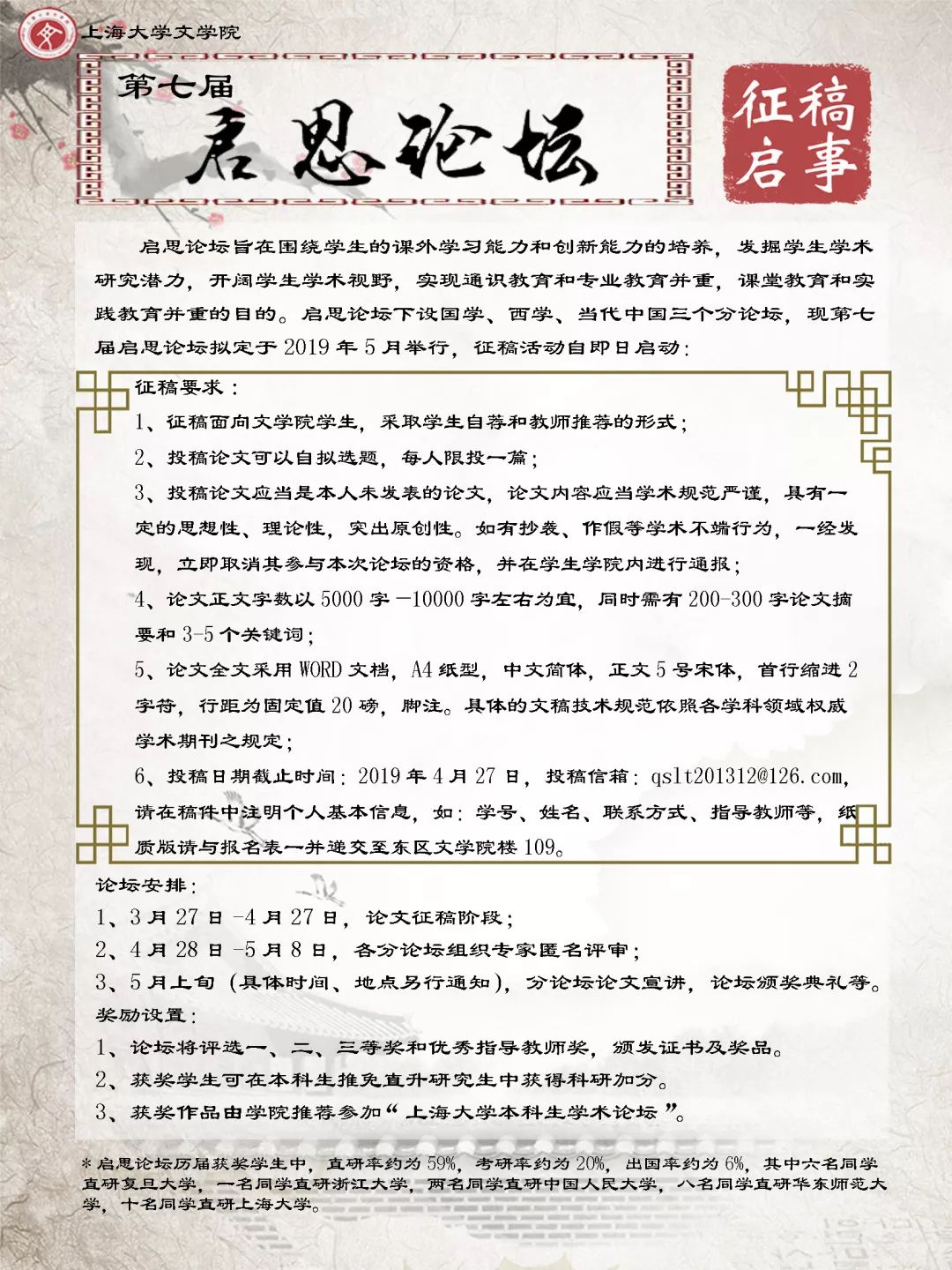 启思论坛旨在围绕学生的课外学习能力和创新能力的培养,发掘学生学术研究潜力,开阔学生学术视野,实现通识教育和专业教育并重,课堂教育和实践教育并重的目的。启思论坛下设国学、西学、当代中国三个分论坛,现第七届启思论坛拟定于2019年5月举行,征稿活动自即日启动:
