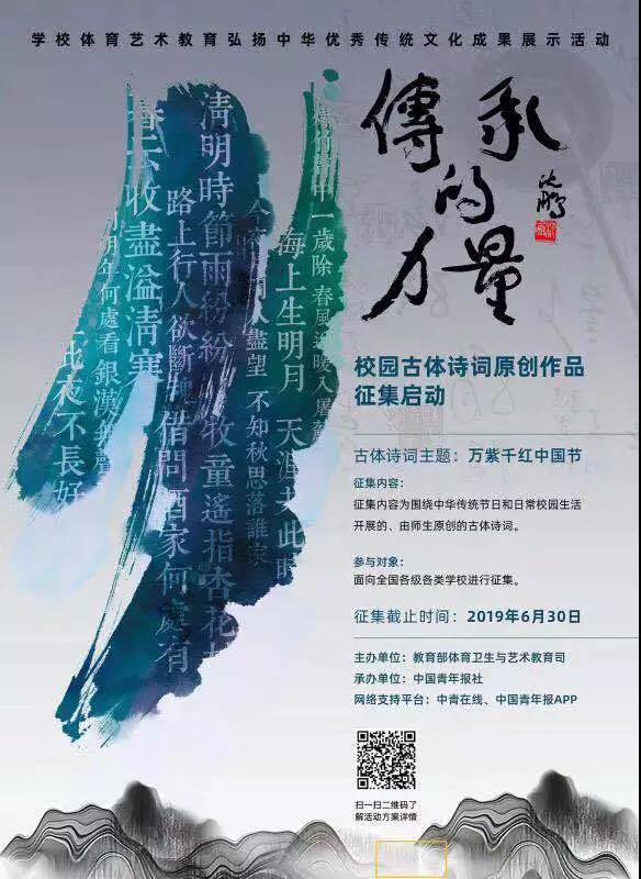 按照《中共中央关于繁荣发展社会主义文艺的意见》《国务院办公厅关于全面加强和改进学校美育工作的意见》要求,由教育部主办、中国青年报社承办的“传承的力量”学校体育艺术教育,弘扬中华优秀传统文化成果展示活动,根植中华优秀传统文化深厚土壤,以春节、清明、端午、中秋等传统节日,元旦、五四青年节、教师节、国庆节等现代节日为契机,加强爱国主义教育,增强民族历史文化传承和国家认同,培育深厚的民族情感。为集中展示学校体育艺术教育,传承中华优秀传统文化成果,经研究决定,现面向全国各大、中、小学校征集校园古体诗词原创作品。
