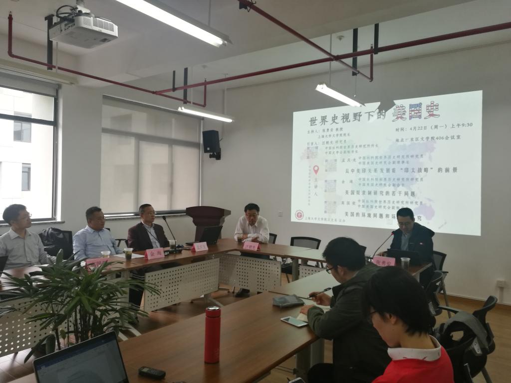 2019年4月22日,中国社科院世界史所长、中国史学会副秘书长汪朝光研究员、中国社科院世界史研究所孟庆龙研究员、金海研究员和高国荣研究员到访tcy8722太阳集团,围绕美国史相关研究给我院师生带来了一场别开生面的学术盛宴。讲座由院长张勇安教授主持,历史系王三义教授、吴浩老师等40多位师生聆听了本次讲座。
