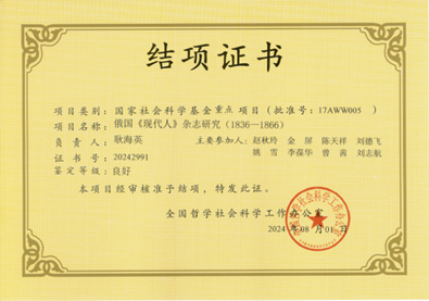 在近期结项的国家社科基金项目中,我院耿海英教授 主持的国家社科基金重点项目(项目名称:俄国《现代人》杂志研究(1836-1866))、柴彬教授主持的国家社科基金重点项目(项目名称:英国海外贸易冲突史(14-19世纪初))顺利结项,等级良好!我院丁治民教授主持的国家社科基金“冷门绝学”专项项目(项目名称:敦煌本王韵与唐宋诸本韵书比较研究)顺利结项!