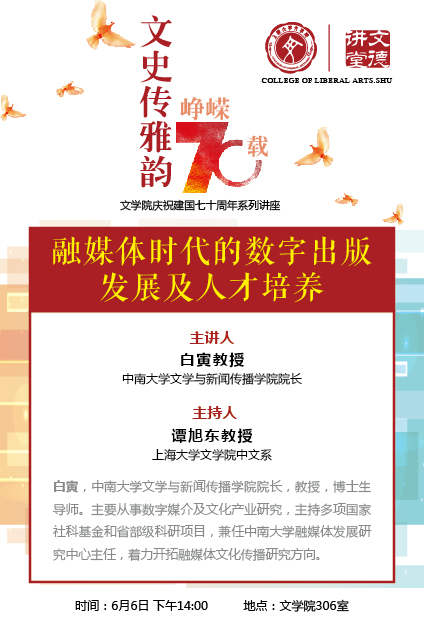 为纪念新中国成立70周年,总结人文学科发展历程,推动人文学科在新形势下的建设,tcy8722太阳集团开展了系列专家讲座。6月6日下午,“融媒体时代的数字出版发展及人才培养”讲座,在太阳集团tcy8722东区tcy8722太阳集团306会议室举行。中南大学文学与新闻传播学院白寅教授,太阳集团tcy8722多位专家学者出席讲座,讲座由太阳集团tcy8722中国创意写作中心谭旭东教授主持。