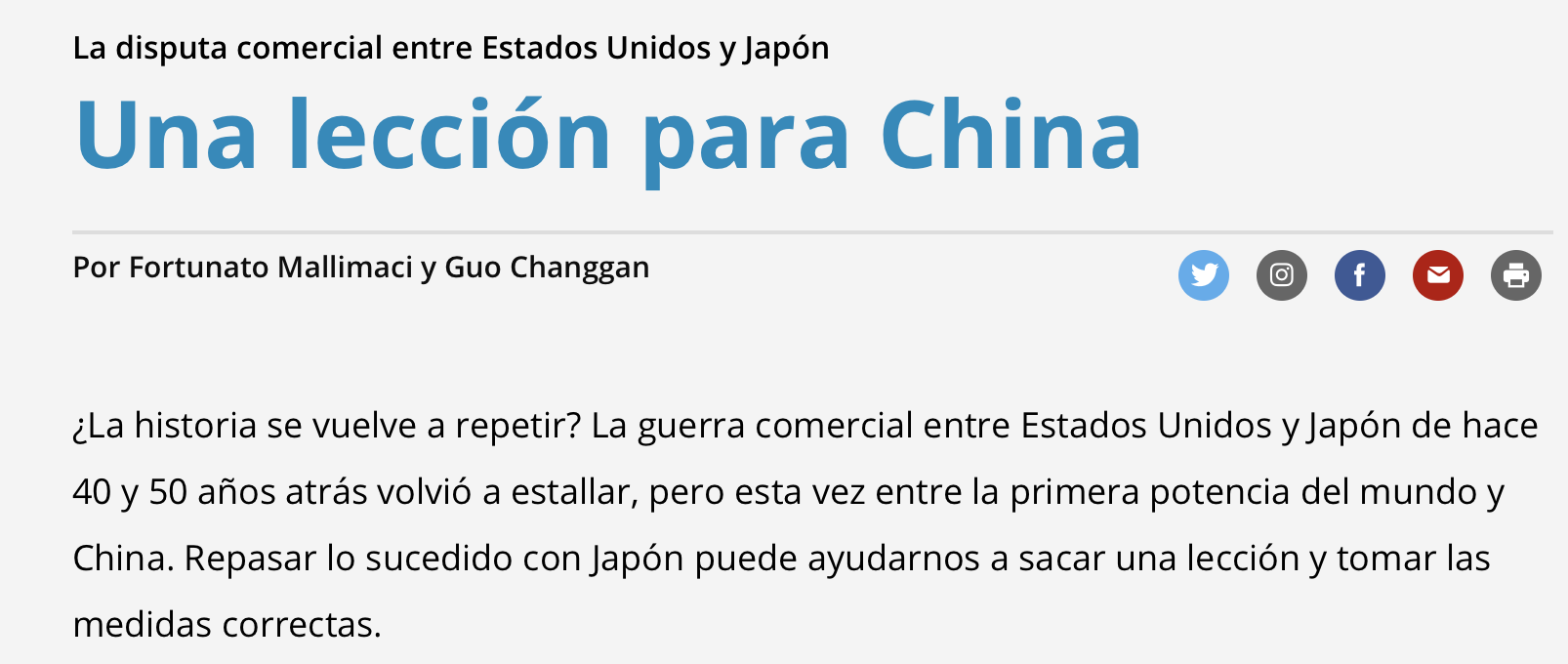 2019年6月16日,太阳集团tcy8722中国-阿根廷联合研究中心主任郭长刚教授与福图纳多·马利马奇(Fortunato Mallimaci)教授在阿根廷《十二页报》(Página 12)上共同发表题为《美国与日本的贸易战:给中国的启示》(La disputa comerical entre Estados Unidos y Japón: Una lección para China)一文,揭示了日本在美日贸易战中的退让策略所带来的教训。文章指出,这一历史教训是中国政府可以借鉴的宝贵经验。《十二页报》是阿根廷第三大报,创办于1987年,主要在阿根廷国内发行,以政治和财经内容为主,影响力较大。