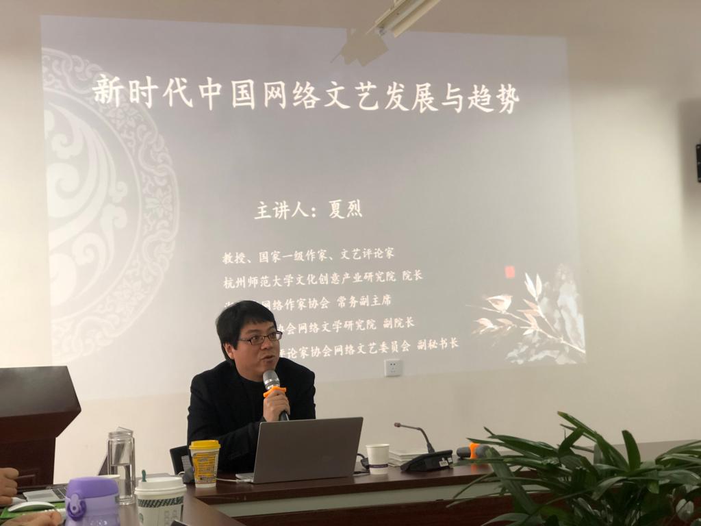 12月5日下午,国内著名的网络文艺研究专家、杭州师范大学文化创意产业研究院院长夏烈教授应邀来tcy8722太阳集团讲座。讲座题为《新时代中国网络文艺发展与趋势》,夏烈教授从互联网处境与21世纪中国文艺的转折、网络文艺的“四新”意义等角度,对网络文艺的发展做了整体梳理,也对当前网络文艺的新变化提出了自己的看法。尤其是他用有力的论证,确认网络文艺是中国文艺发展的新方向,并指出网络文艺是国家意识形态塑造的新契机。这些观点,引起了在座听众的思考和共鸣。