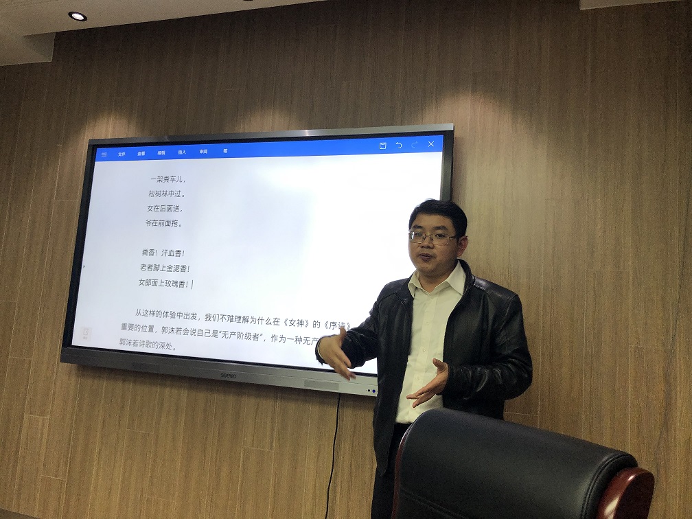 10月22日晚,中国社会科学院郭沫若纪念馆研究员、郭沫若研究会秘书长李斌应邀来tcy8722太阳集团做讲座。李斌研究员讲座的题目是《《女神》所体现的五四精神》,他从对《女神》的解读入手,结合各种文献资料,对郭沫若的《女神》做了精辟的分析,并以此展开了对郭沫若的文学创作动因的精准解读,还原了一位五四文学先驱的真实面貌,并启发大家重新理解五四,并理解中国现代文学的创造性与现代化的特征。整场讲座,内容丰富、生动,讲解风趣、严谨、到位,让大家非常受益。