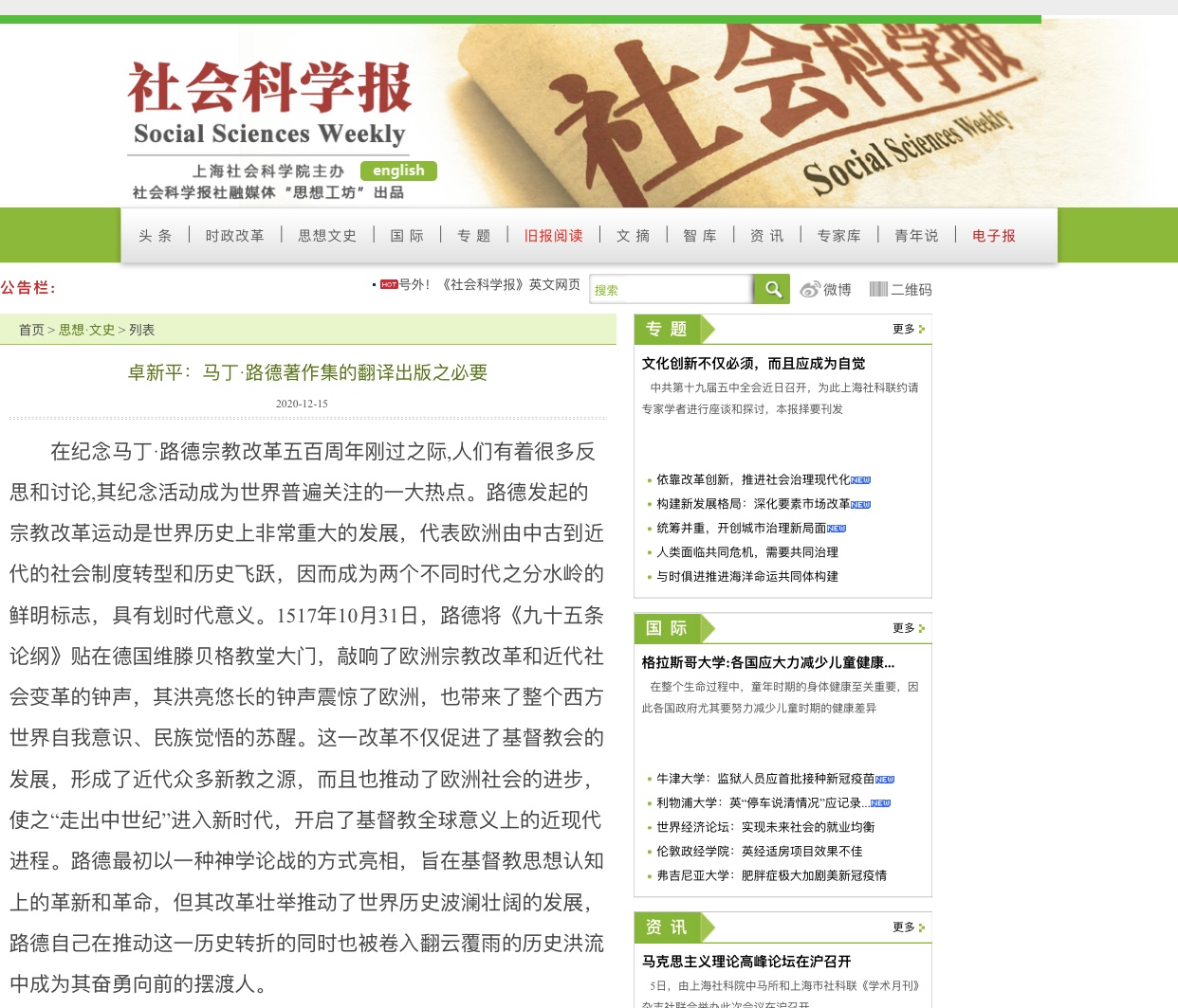 本次会议虽是在线上举行,但仍然感受到学者对于问题探讨的热情。部分学学者的精彩发言得到网络媒体的关注。上海社会科学院《社会科学报》在网络版于2020年12月15日提前发表了本次会议的部分发言稿,如全国人大常委、中国社会科学院学部委员及中国宗教学会原会长卓新平教授的“马丁路德著作集的翻译出版之必要”和中国人民大学原副校长杨慧林教授的“从马丁路德再读‘正义’与‘合法’、‘公义’与‘自义’”。