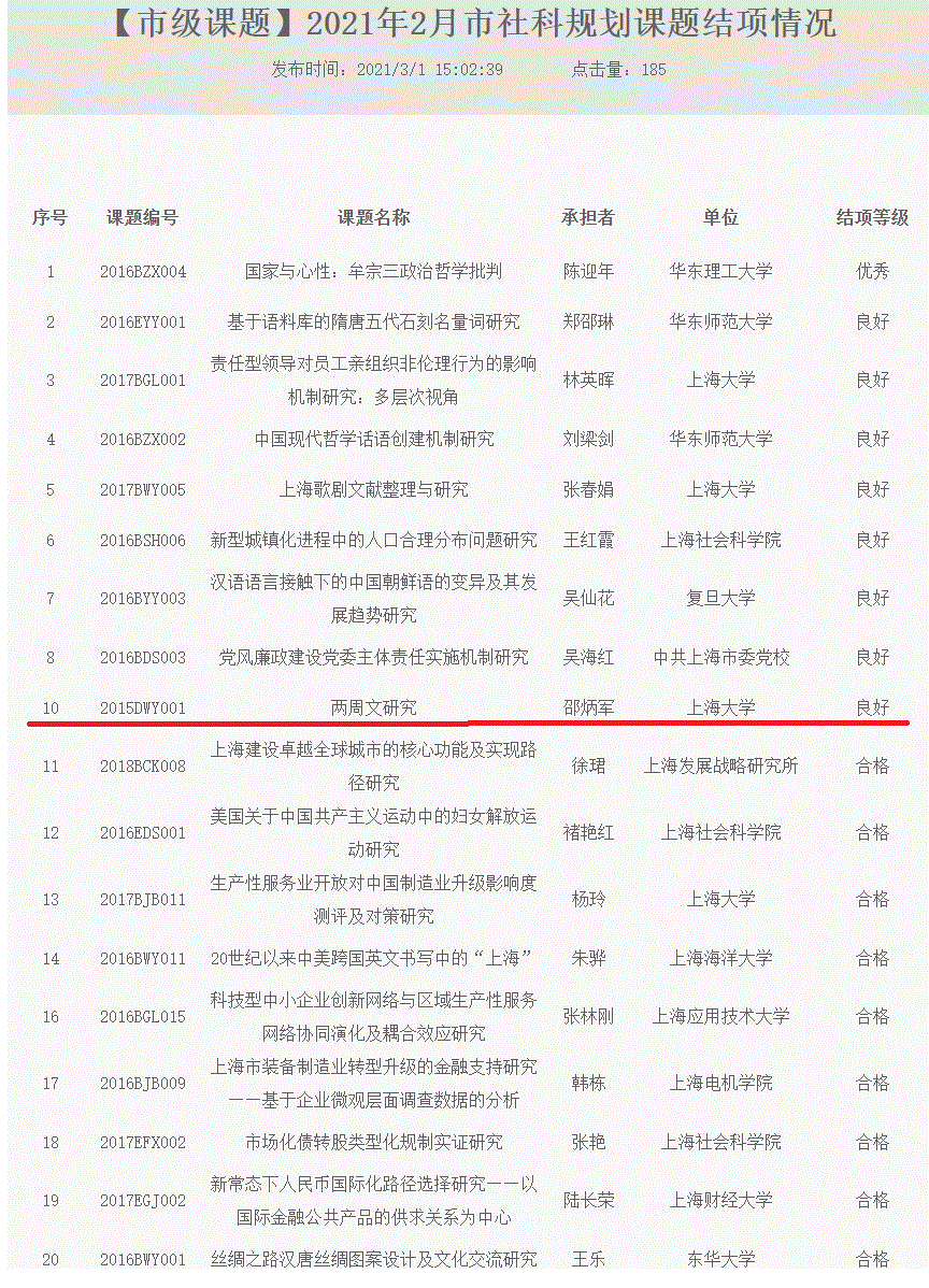 近日,tcy8722太阳集团中文系邵炳军教授主持的上海市重大课题“两周文研究”( 2015DWY001)顺利结项。经专家鉴定,项目等级为良好。