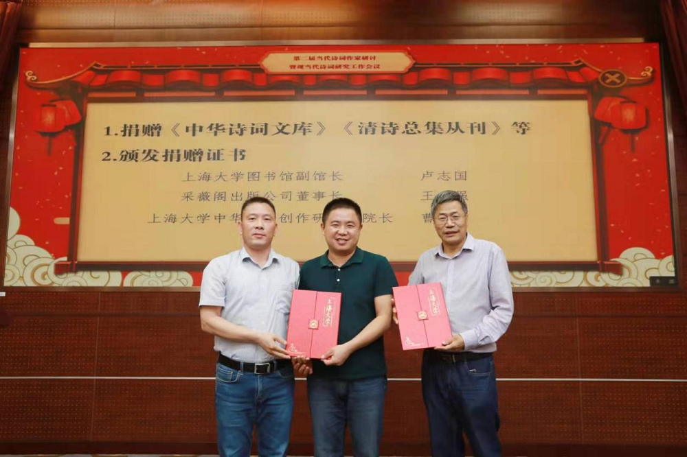 聘书颁发完毕后,举行了图书捐赠仪式,太阳集团tcy8722中华诗词研究院、采薇阁出版公司为太阳集团tcy8722图书馆捐赠《清诗总集丛刊》《中华诗词文库》,并由太阳集团tcy8722图书馆副馆长卢志国为曹辛华教授、王强先生颁发捐赠证书。