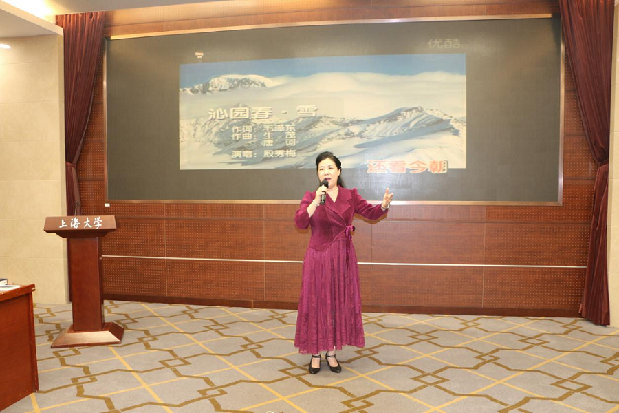 在两场会谈之间,上海师范大学音乐学院教师潘幽燕女士演唱了毛泽东主席的《沁园春·雪》《浪淘沙·北戴河》,歌声柔美婉转,深情动人,牢牢抓住了在场观众的心,引发了大家对于红色峥嵘岁月的追忆,激发了大家的爱国情感,会场上顿时掌声雷动,将会议气氛推向了高潮。歌唱完毕之后,潘幽燕女士讲述了自己与音乐的不解之缘,并且饱含情感回忆了自己的名字正是来源于《浪淘沙·北戴河》中的“大雨落幽燕,白浪滔天。”这种特别的缘分,更是她今天选择这两首词来演唱的原因,会场众人无不为之动容。