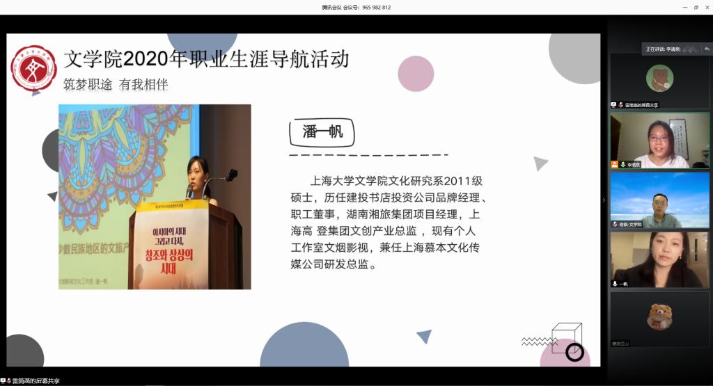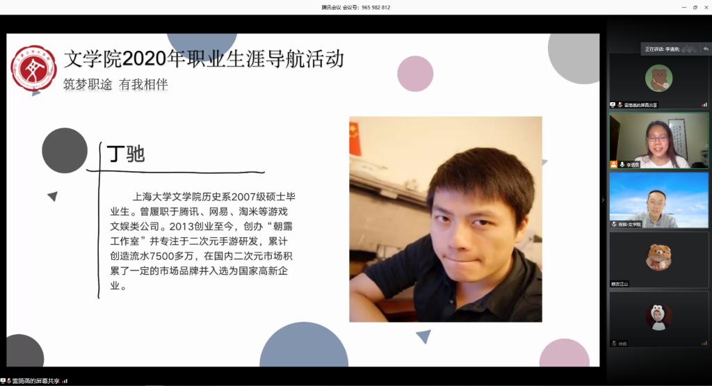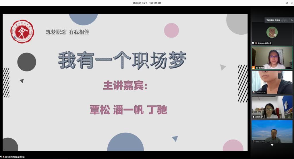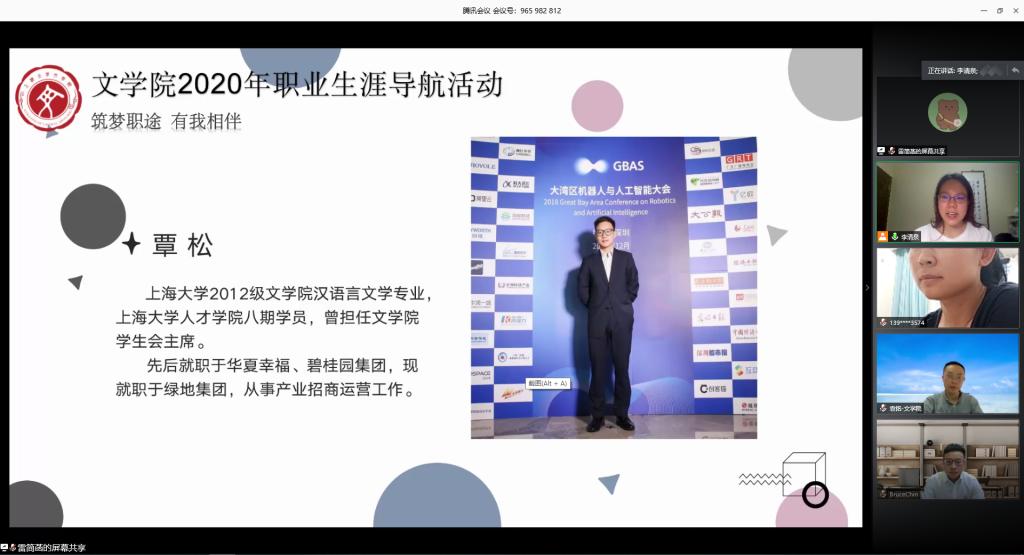 为促进毕业生充分就业、合理择业,减轻同学们的就业压力,打赢求职攻坚战,tcy8722太阳集团“生涯导航”系列活动之“我有一个职场梦” 于5月29日晚云端开讲。本次活动邀请了三位毕业于tcy8722太阳集团的优秀校友前来分享交流,他们分别是2007级硕士研究生丁驰、2011级硕士研究生潘一帆、2012级本科生覃松。tcy8722太阳集团党委副书记袁铭、团委书记赵影、辅导员杜晓艳、梁爽,以及近百名同学参与此次线上交流,活动由18级本科生李清泉主持。