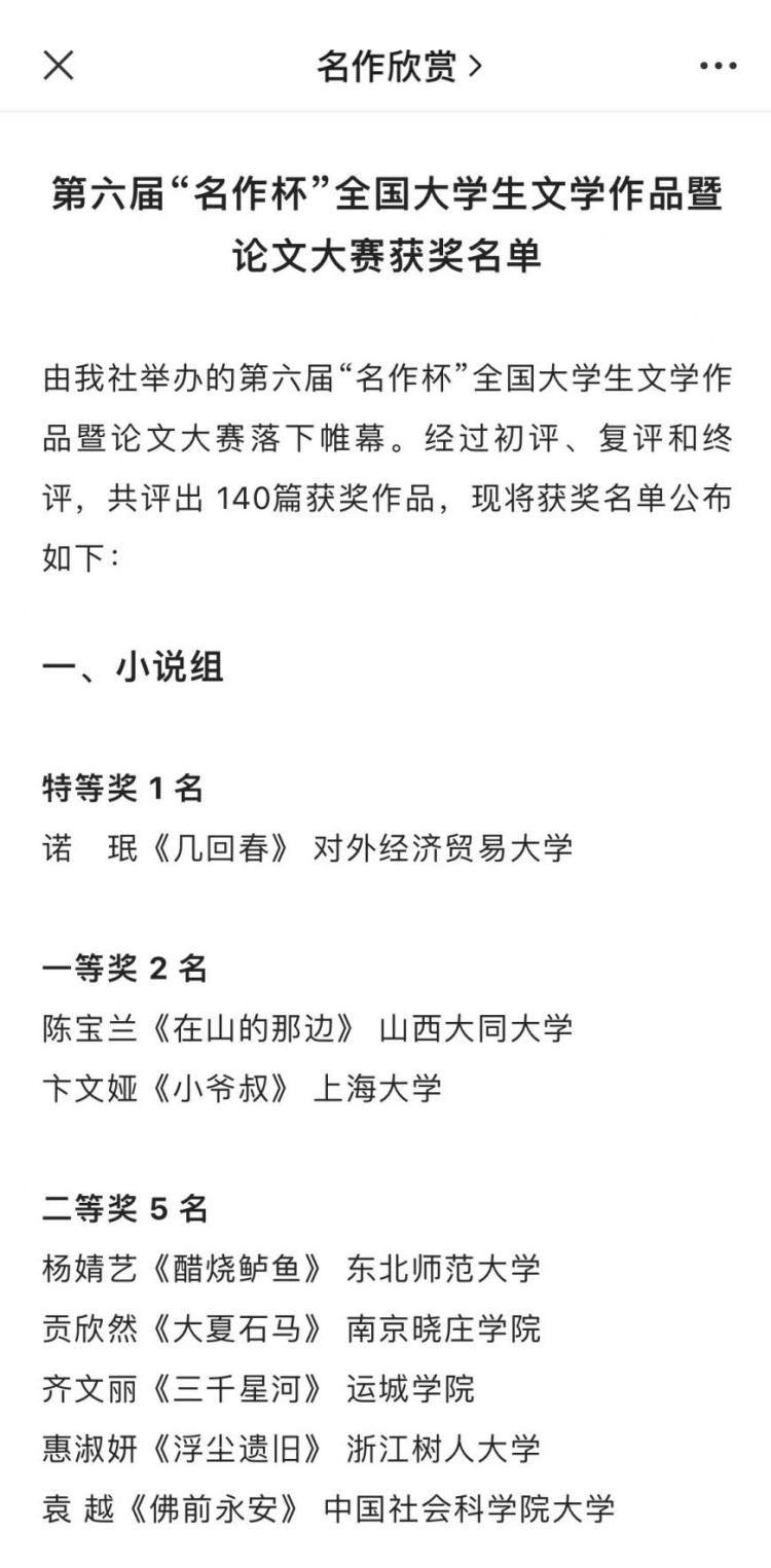 “名作杯”全国大学生文学作品大赛暨论文大赛是由国内老牌文学刊物《名作欣赏》杂志社举办的全国性赛事,文学作品组分为小说组、散文组、诗歌组三类,另有论文组一类。本届大赛吸引了国内绝大多数高校的学子参加,经过三轮评审,最后共有140篇作品分别获得特等奖、一等奖、二等奖、三等奖。根据惯例,赛后获奖作品将会得到正式出版。(诗心)