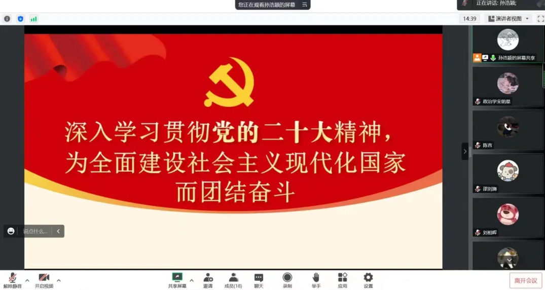 10月29日下午,21级中文系硕士研究生党支部于腾讯会议召开专题组织生活,学习党的二十大报告相关内容。本次组织生活的主题为“学习党的二十大报告对青年人的寄语”,会议由组织委员兼纪检委员王秋露同志主持。支部全体党员参加会议。