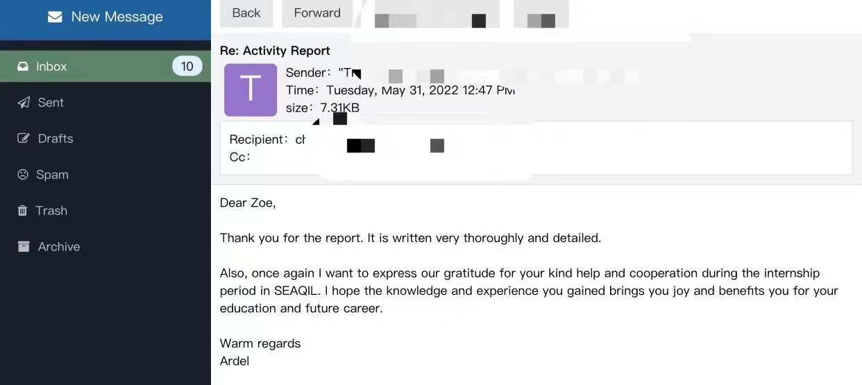 本人于2022年3月14日至2022年6月14日在东南亚教育部长组织-语言教师与语言教育工作者进修区域中心(SEAMEO QITEP in Language)进行了为期三个月的远程实习,实习岗位为中文老师,实习的主要任务是教授印度尼西亚大学生中文,与学生协作共同制作相关的中文教学视频,并提供内容、语言和技术方面的建议和意见,并将视频上传至SEAMEO QITEP in Language的官方频道进行中文和中国文化的传播。此外,在课下,我负责制作教案,撰写课程日志,通过学生课堂表现评估其中文口语水平,在实习期的最后,我还制作了四支视频介绍了中国的文化与生活以作为印尼学生学习中文的补充材料,同时,作为对整个实习期的回顾,我向主管递交了一份实习报告,获得了主管的认可与赞赏,为自己为期三个月的实习画上了一个圆满的句点。